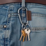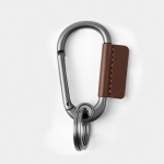 Llavero metálico con gancho tipo carabina. Incluye pieza de curpiel que estiliza su diseño y dos aros portallaves. Práctico para sujetar y organizar tus llaves con un toque moderno y funcional.