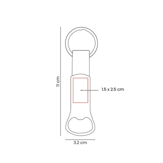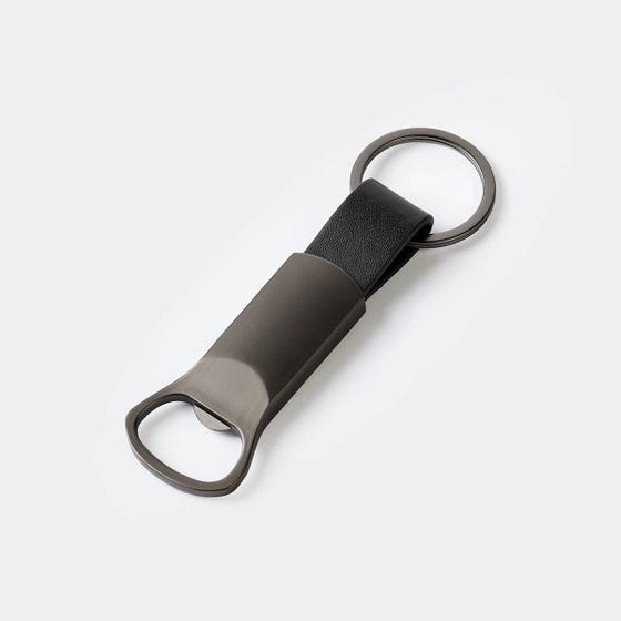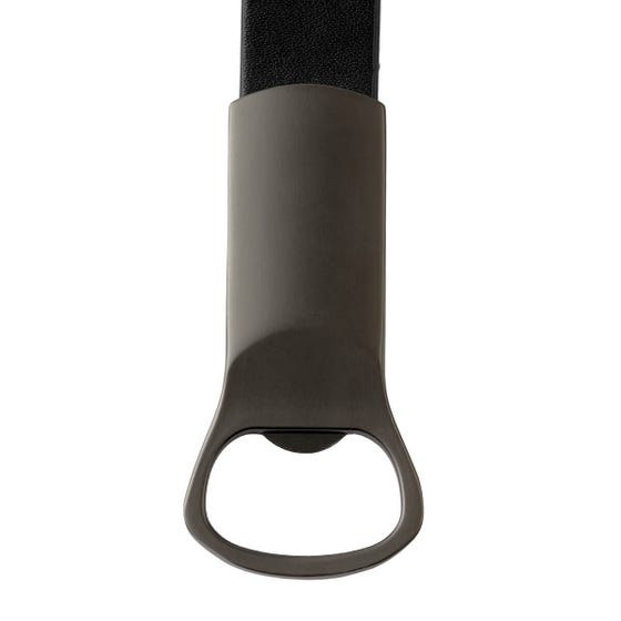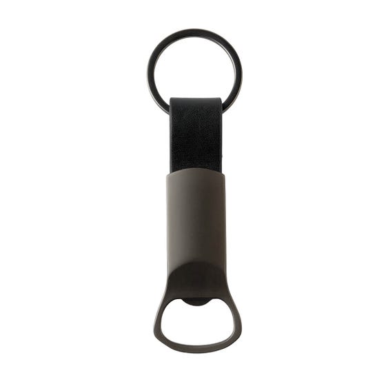 Llavero destapador metálico con terminado mate. Detalle en curpiel que estiliza su diseño.