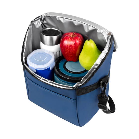 Lonchera con interior plastificado y un cierre en el compartimiento principal de amplia apertura, para un acceso rápido y sencillo a su interior. Incluye un bolsillo frontal para utensilios pequeños. Su asa para hombro desmontable permite transportarla cómodamente. Capacidad 12 latas.