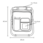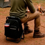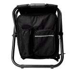 Lonchera tipo backpack con compartimento principal, doble cierre, bolsa frontal con cierre, bolsa trasera y compartimento para bebidas. Cuenta con tirantes con correas ajustables y tubos metálicos para convertirla en silla plegable.