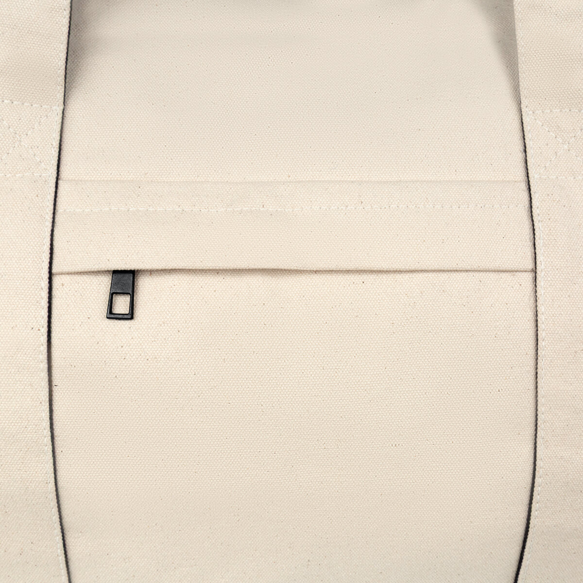 Su compartimento principal con cierre destaca por su tamaño súper amplio, perfecto para llevar todo lo necesario con comodidad. Incluye asas de mano para un fácil agarre y una práctica asa para hombro removible, sujeta con un broche de plástico para mayor seguridad. Además, cuenta con un bolsillo frontal con cierre que brinda acceso rápido a objetos pequeños o esenciales. Esta maleta ecológica está fabricada con material algodón, es la compañera ideal para viajes o escapadas de fin de semana.