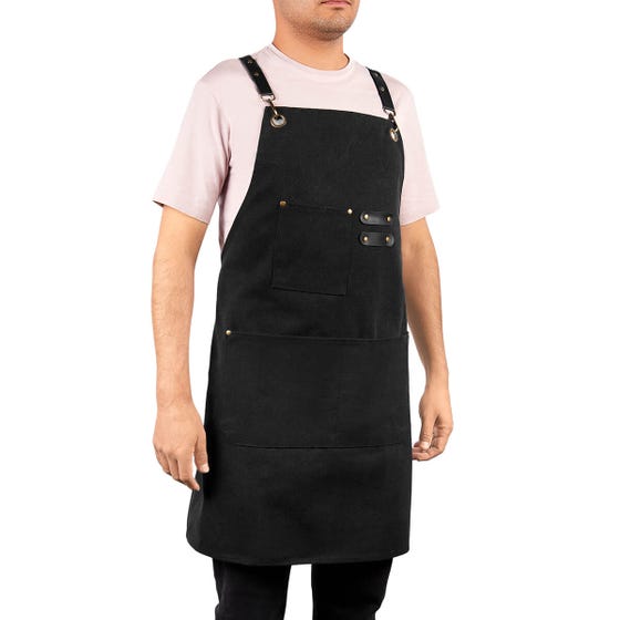 Incluye tres bolsillos frontales: uno en la parte superior, ideal para objetos pequeños, y dos en la parte inferior, perfectos para herramientas, utensilios o accesorios. Cuenta con tirantes ajustables con hebillas metálicas y remaches que aportan mayor resistencia y un toque de estilo. Su diseño cruzado en la espalda ofrece mayor comodidad. Elaborado para entornos de trabajo exigentes, desde cocinas industriales hasta talleres o espacios creativos.