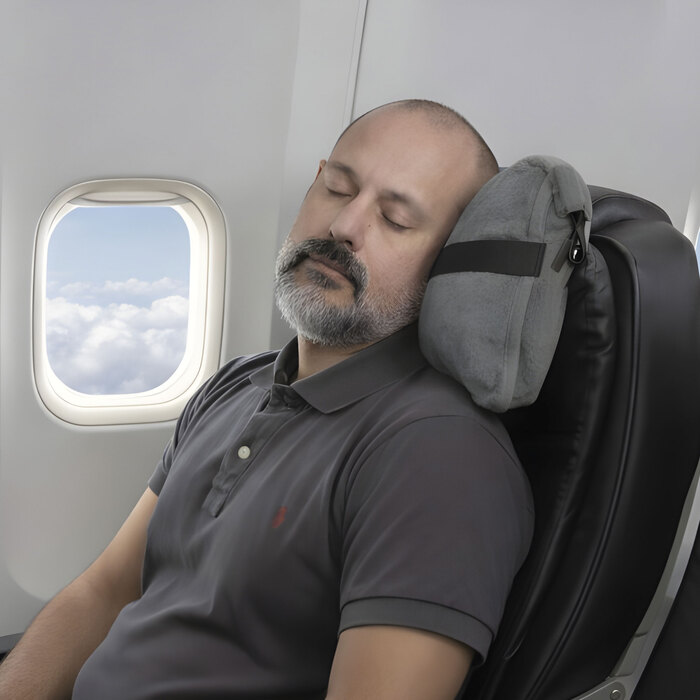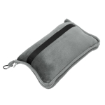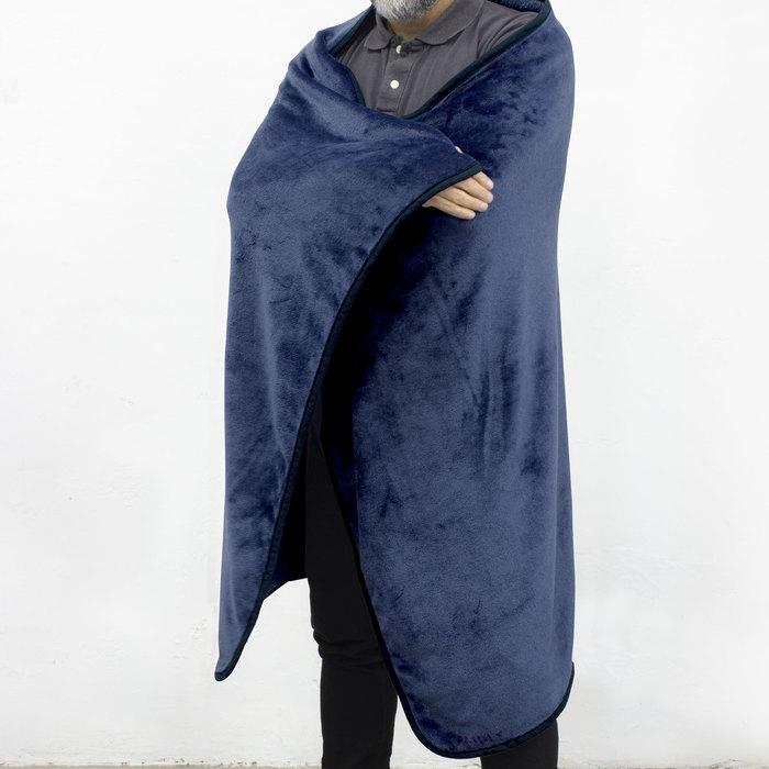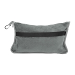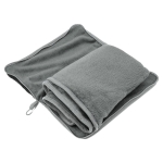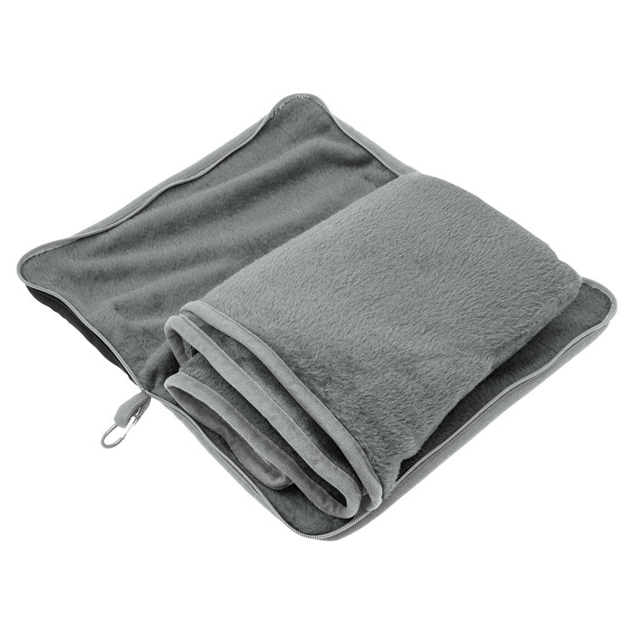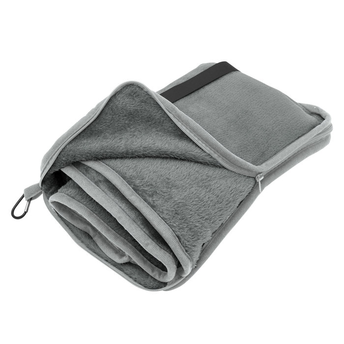 Manta y almohada de viaje compacta 2 en 1. Manta de polar de alta calidad con textura aterciopelada al tacto. Doble felpa, de pelo corto y largo. Funda con cierre del mismo material, con mosquetón para colgar en mochila y tira para sujetar la mochila en la manija extensible de un equipaje de mano. Cuando la manta está plegada y dentro de la funda se puede utilizar como almohada.