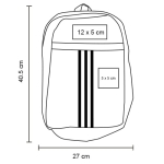 Mochila de poliéster con compartimento principal, un compartimento frontal con cierre, tirantes ajustables y asa superior.