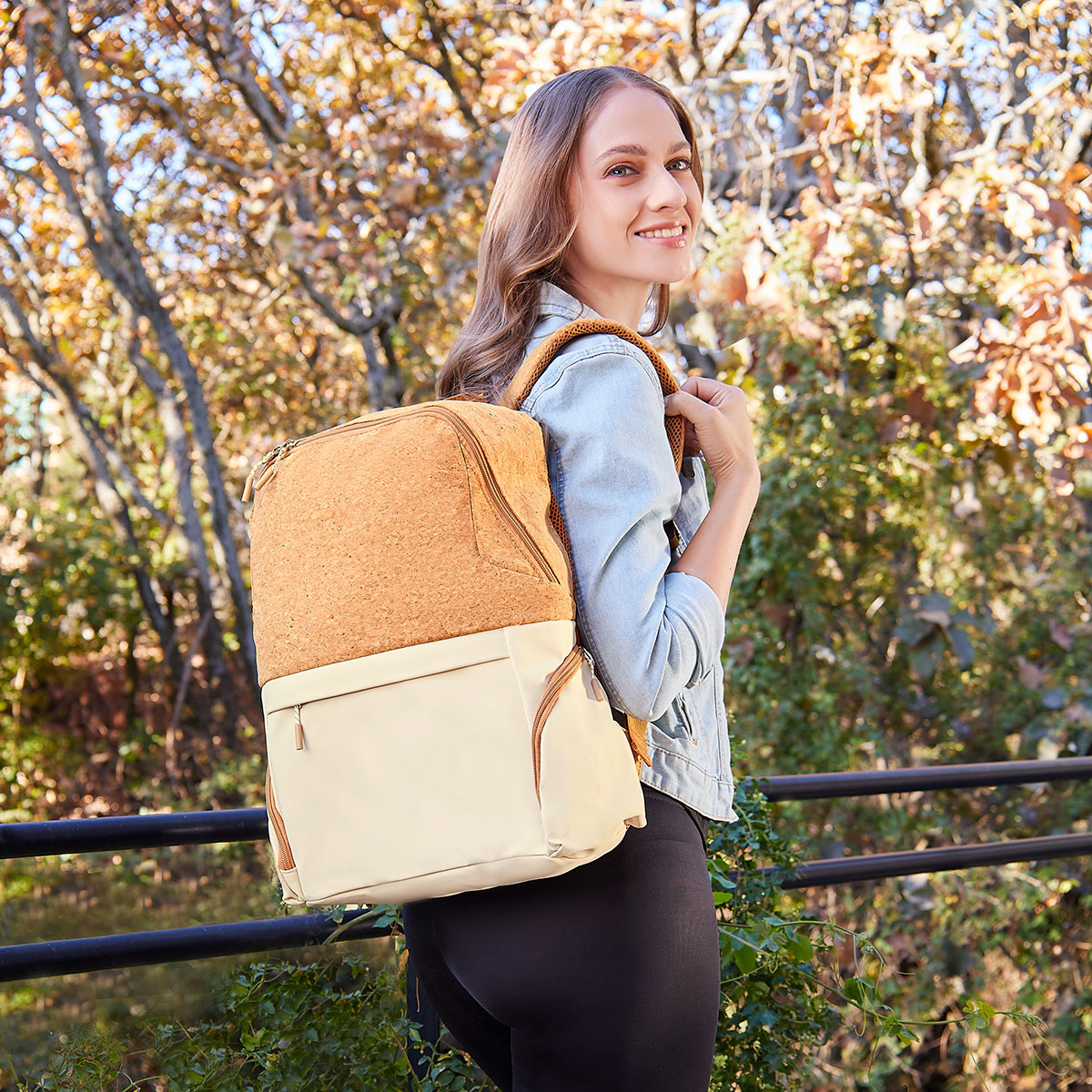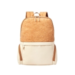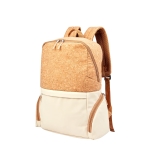 Mochila con curpiel y corcho. Bolsa principal cuenta con espacio para laptop de 15″. Bolsillo frontal con cierre y dos bolsillos laterales para tus objetos esenciales. Parte trasera acolchada ofrece mayor confort. Incluye banda para colocar en trolley, asas para hombro ajustables y asa superior.