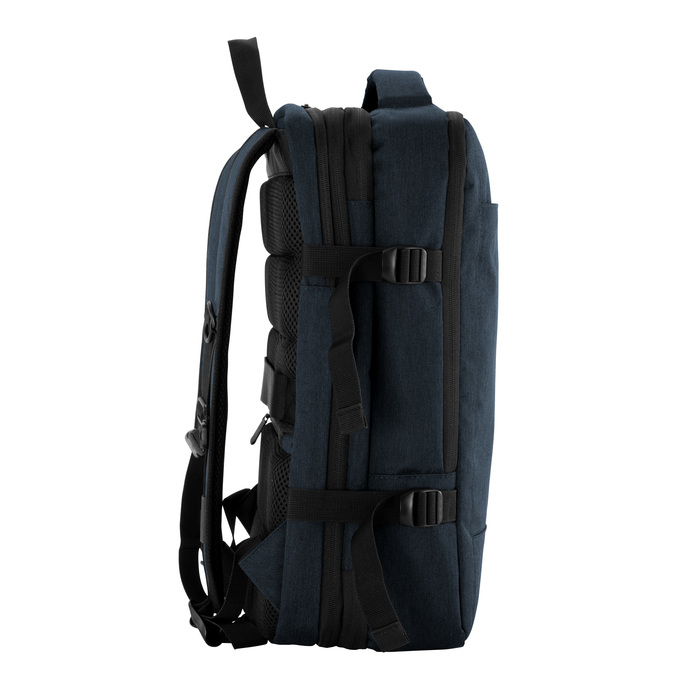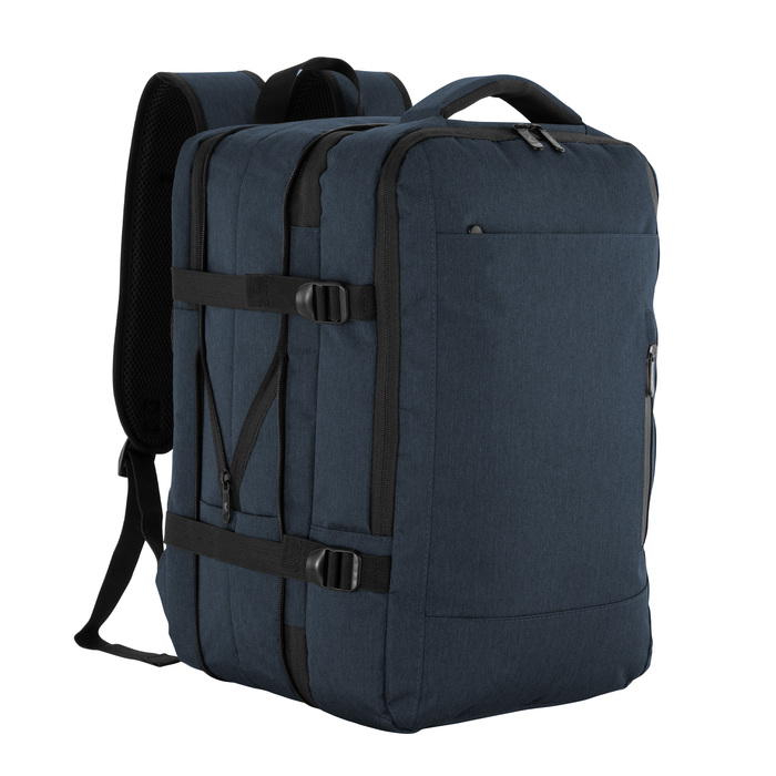 Mochila carry on con 3 compartimentos acolchados. Compartimento principal central expandible con cierre de apertura 360°, interior con cubierta de red con cierre perimetral y bolsillo con cierre horizontal. Compartimento posterior con cierre, bolsillo portanotebook de hasta 16 pulgadas con tira de seguridad con cierre de velcro y bolsillo plano . Compartimento frontal, exterior con bolsillo con cierre horizontal y bolsillo vertical con cierre impermeable, interior con bolsillos organizadores y un bolsillo de red. Asa acolchada y reforzada para mejor traslado. 2 correas de hebillas ajustables al volumen que se traslade. Espalda acolchada con red que permite ventilación. Tira para sujetar la mochila en la manija extensible de un equipaje de mano y bolsillo de seguridad con cierre. Correas acolchadas. Tiradores de cierre metálicos.