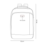 Mochila ejecutiva con capacidad de carga USB (batería portátil no incluida). Bolsa principal con dos pequeños compartimentos de malla y uno para documentos. Bolsa trasera con compartimento para laptop de hasta 15″ que incluye dos tiras elásticas para sujeción. Bolsa frontal con organizador interno y bolsillo adicional con cierre vertical, este compartimento cuenta con un cierre discreto para poder montar la placa metálica. Bolsillo lateral que puede ampliarse mediante un cierre. En la parte trasera incluye trolley, respaldo y tirantes acojinados.