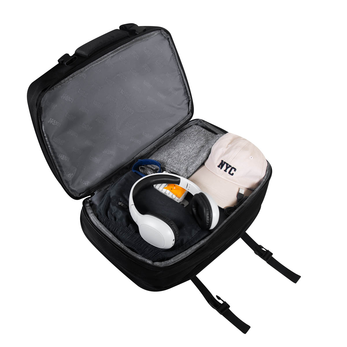 Mochila con amplios espacios diseñados para todas tus pertenencias personales. Esta mochila cuenta con un compartimento acolchado para laptop de hasta 16″. Su capacidad de almacenamiento se expande fácilmente para adaptarse a tus necesidades. Equipada con una agarradera superior y lateral lo que te ofrece trasladarla de manera versátil. Las asas acolchadas para llevar en la espalda garantizan comodidad durante todo el día, mientras que la conveniente salida USB te permite cargar tu dispositivo móvil sobre la marcha. Además, la banda en la parte posterior facilita su transporte en trolley.