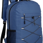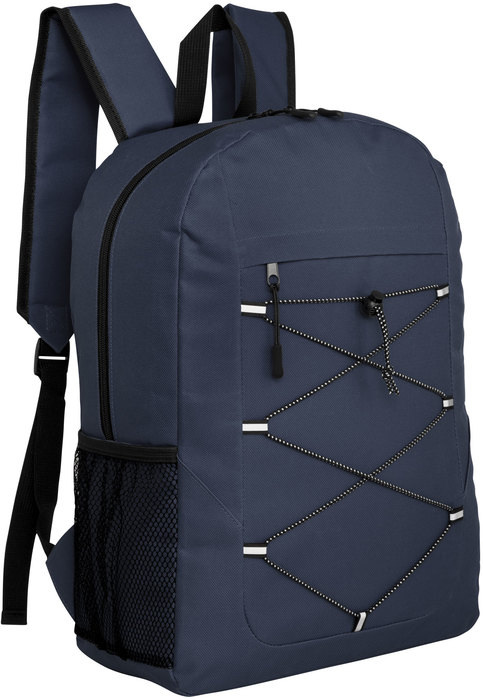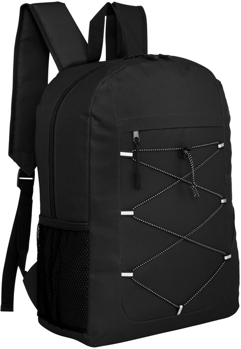 Mochila outdoor. Compartimento principal con doble cierre. Bolsillo frontal con cierre, cordón elástico cruzado ajustable y un bolsillo de red lateral para transportar botellas. Detalles reflectivos. Cierres metálicos con tiradores de goma. Correas regulables y espalda acolchadas.