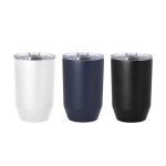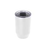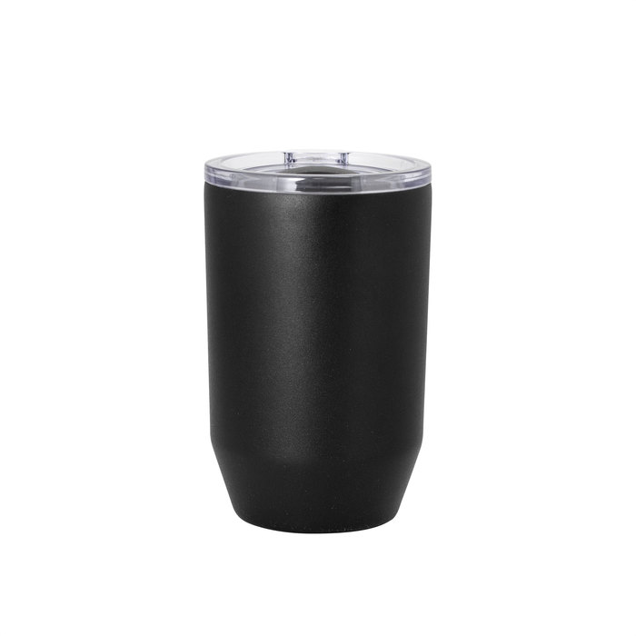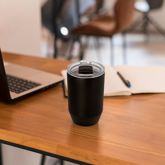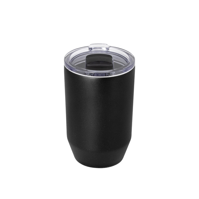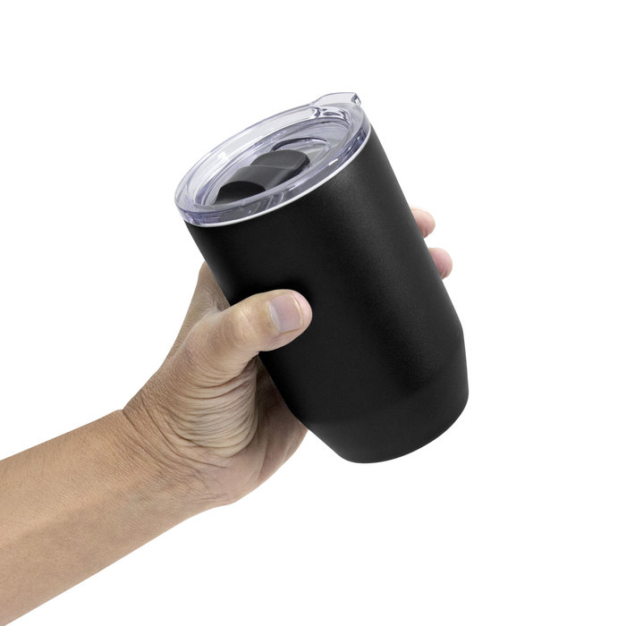 Mug doble pared, sellado al vacío. Mug con aislamiento térmico. Tecnología vacuum. Interior en acero 304 y exterior en acero 201. Tapa de poliestireno transparente a presión, con anillo de silicona y cierre deslizante de color negro. Pintura powder coat (pintura más duradera y resistente a la corrosión y el paso del tiempo). Mantiene hasta 12 hs la temperatura de las bebidas calientes y 24 hs de las bebidas frías.