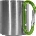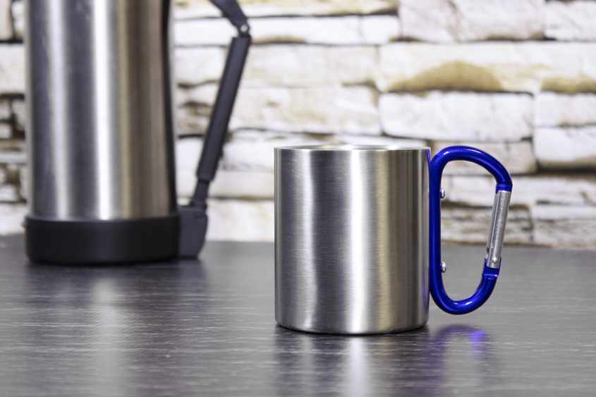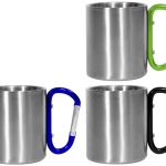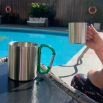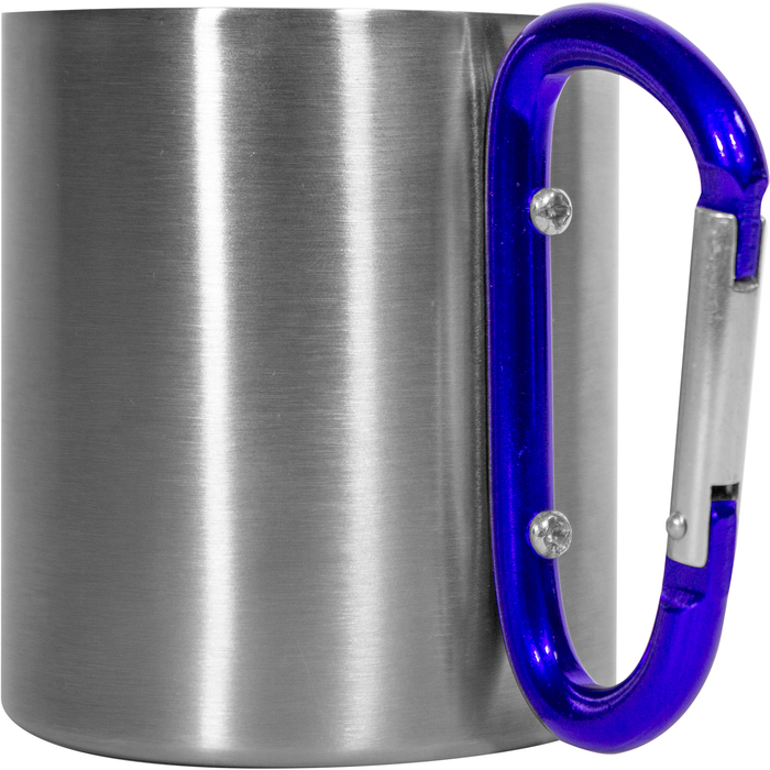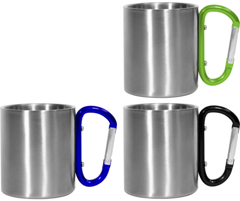 Mug doble pared con Mosquetón. Interior de acero 304 y exterior de acero 201. Asa carabinero de aluminio con diferentes opciones de color. Mantiene las bebidas frías y calientes por más tiempo. Te acompaña donde vayas, ideal para camping o cualquier actividad al aire libre.