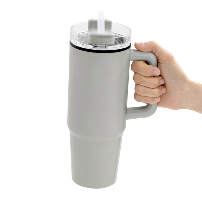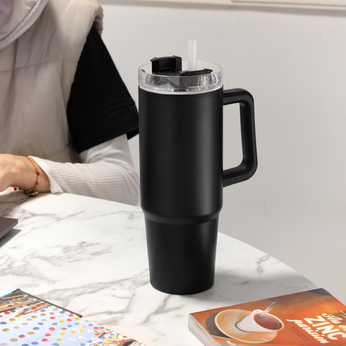 Mug doble pared con popote. Interior de plástico Polipropileno y exterior de acero 201. Tapa plástica transparente a rosca con anillo de silicona. Cierre giratorio porta sorbete. Popote plástico translucido. Pintura exterior con acabado mate. Mantiene las bebidas frías y calientes por más tiempo.