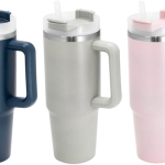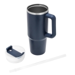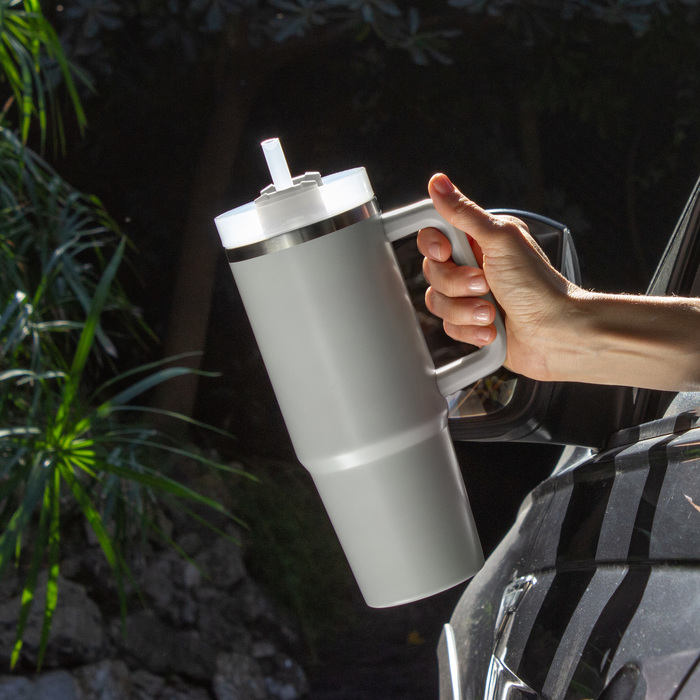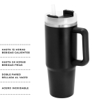 Mug doble pared, sellado al vacío con sorbete. Tecnología Vacuum. Interior en acero 304 y exterior en acero 201. Tapa plástica transparente a rosca con anillo de silicona. Cierre giratorio porta sorbete. Sorbete plástico translucido. Pintura exterior con acabado mate. Mantiene hasta 12 hs la temperatura de las bebidas calientes y 24 hs de las bebidas frías.
