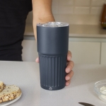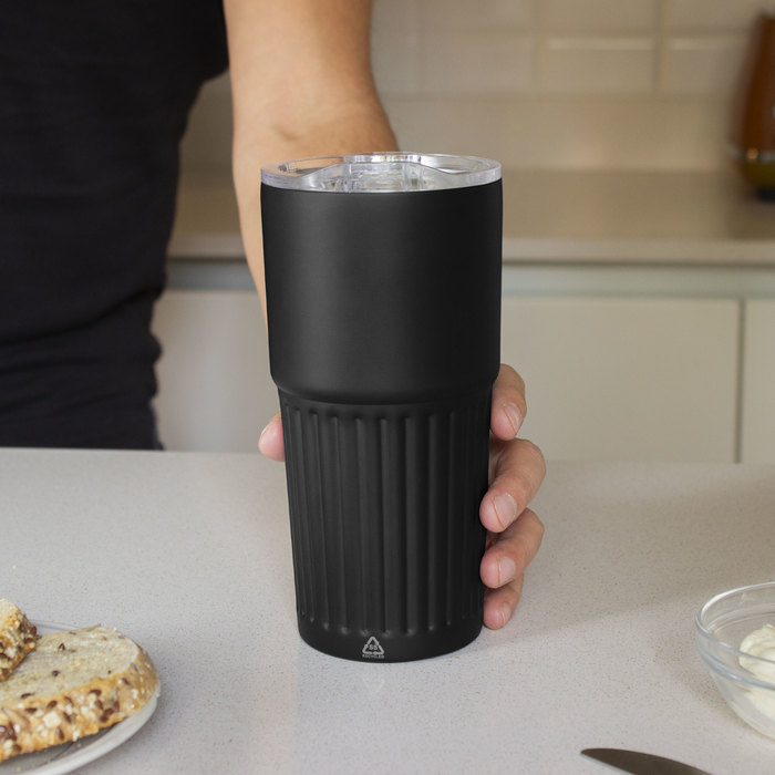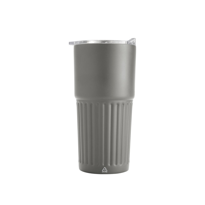 Mug doble pared, sellado al vacío. Mug con aislamiento térmico. Tecnología vacuum. Interior en acero 304 reciclado y exterior en acero 201. Tapa de poliestireno con anillo de silicona. Pintura acabado semi mate. Parte inferior texturada para un mejor agarre. Base antideslizante. Mantiene hasta 12 hs la temperatura de las bebidas calientes y 24 hs de las bebidas frías.