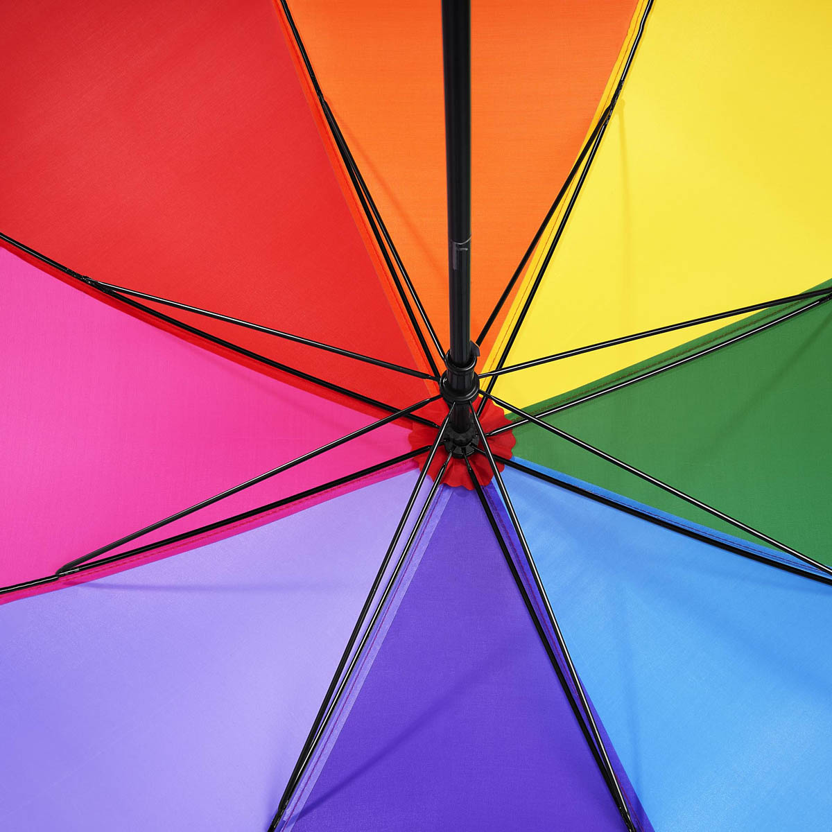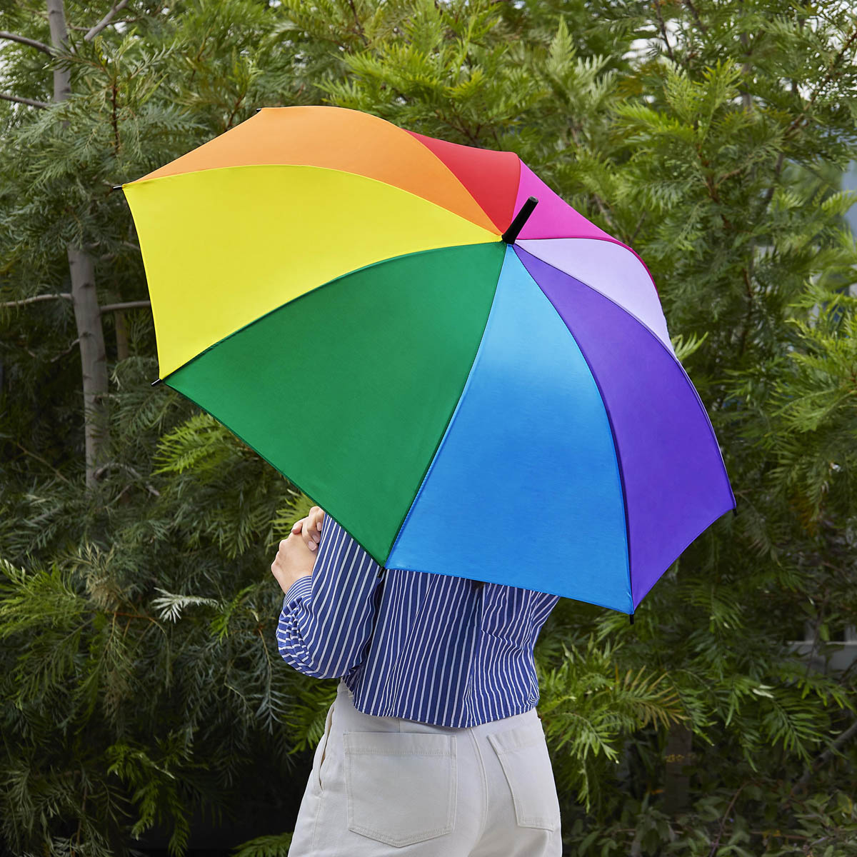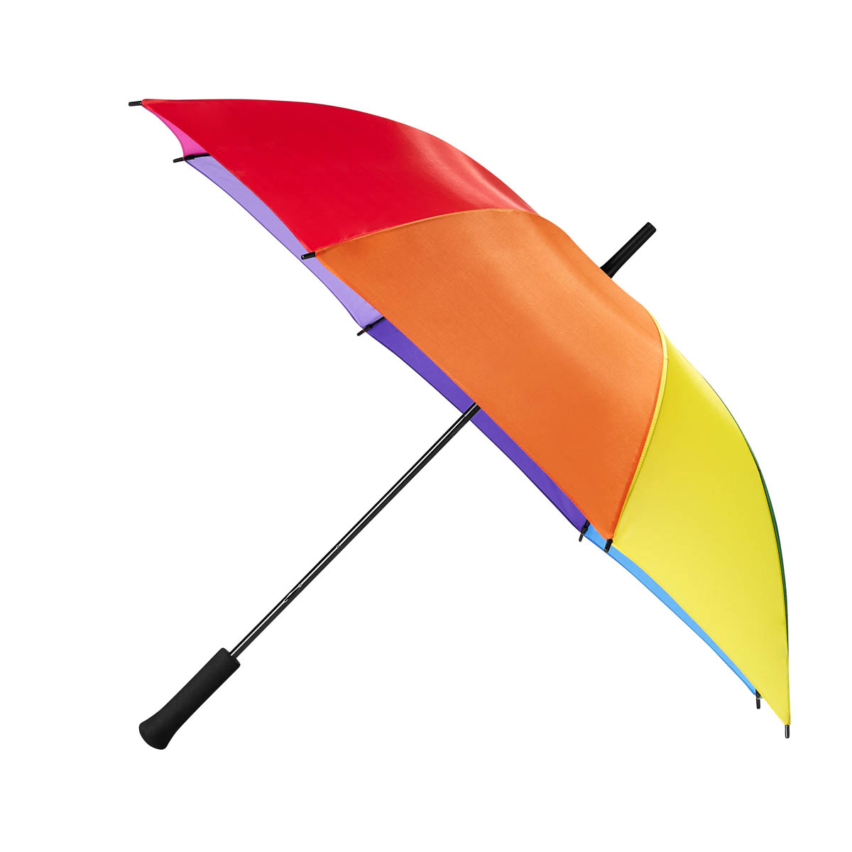 Paraguas de 8 paneles, cada panel de un color. Sistema manual. Mango de esponja. Su diseño arcoíris, colorido y alegre refleja la diversidad y la inclusividad.