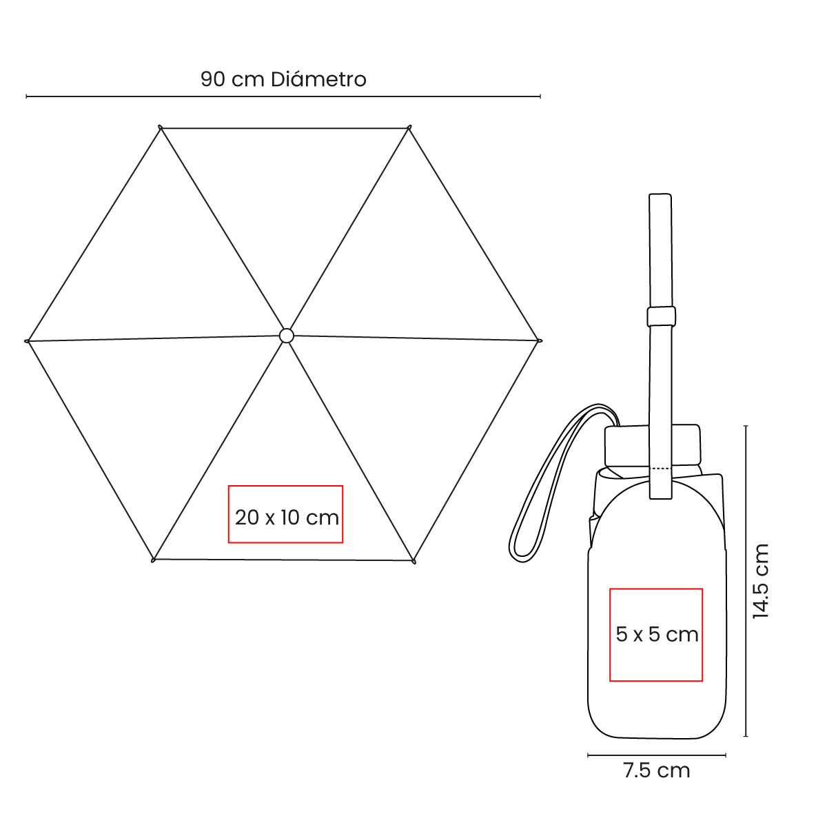 Área de impresión: 20 x 10 cm Paraguas / 5 x 5 cm Estuche