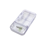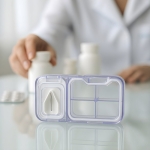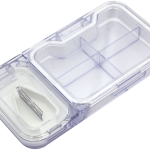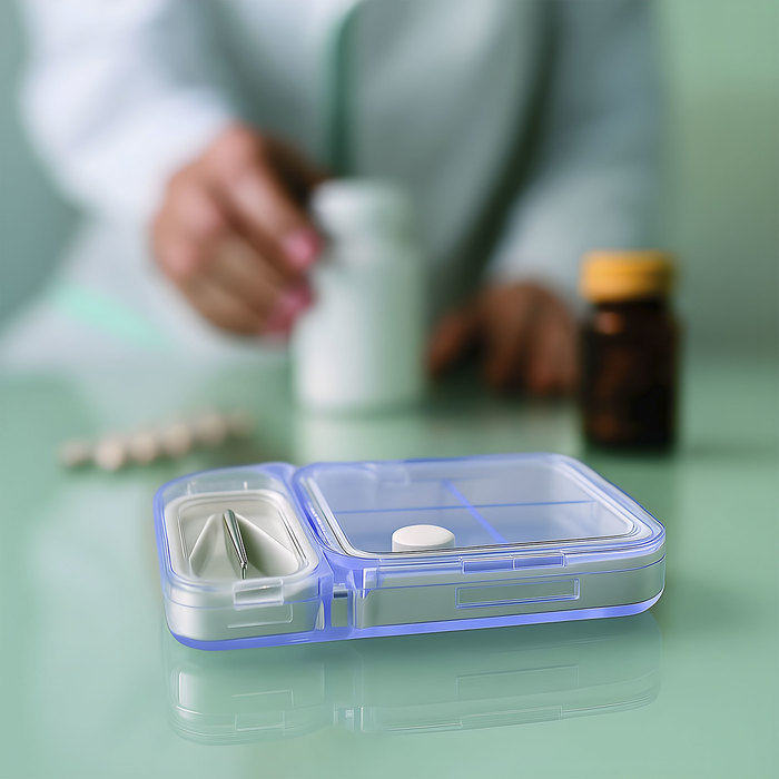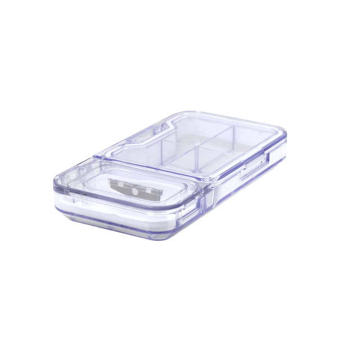 Pastillero organizador corta pastilla. Compartimento principal con cuatro divisiones y recubrimiento perimetral de silicona. Compartimento secundario con base de silicona y soporte regulable de pastillas. Cuchilla de acero incorporada en la tapa. Ambos compartimentos con tapa rebatible y cierre a presión.
