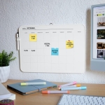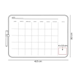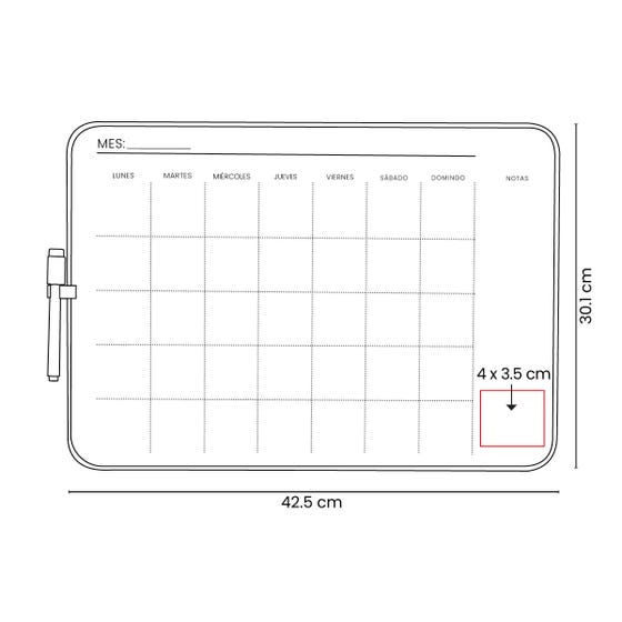 Pintarrón con planeador mensual ideal para organizar tus prioridades. Incluye marcador con borrador y gancho superior para colgarlo fácilmente en tu espacio de trabajo. Su retícula te permite personalizar mes y días, perfecto para uso diario en el hogar, oficina o colegio.