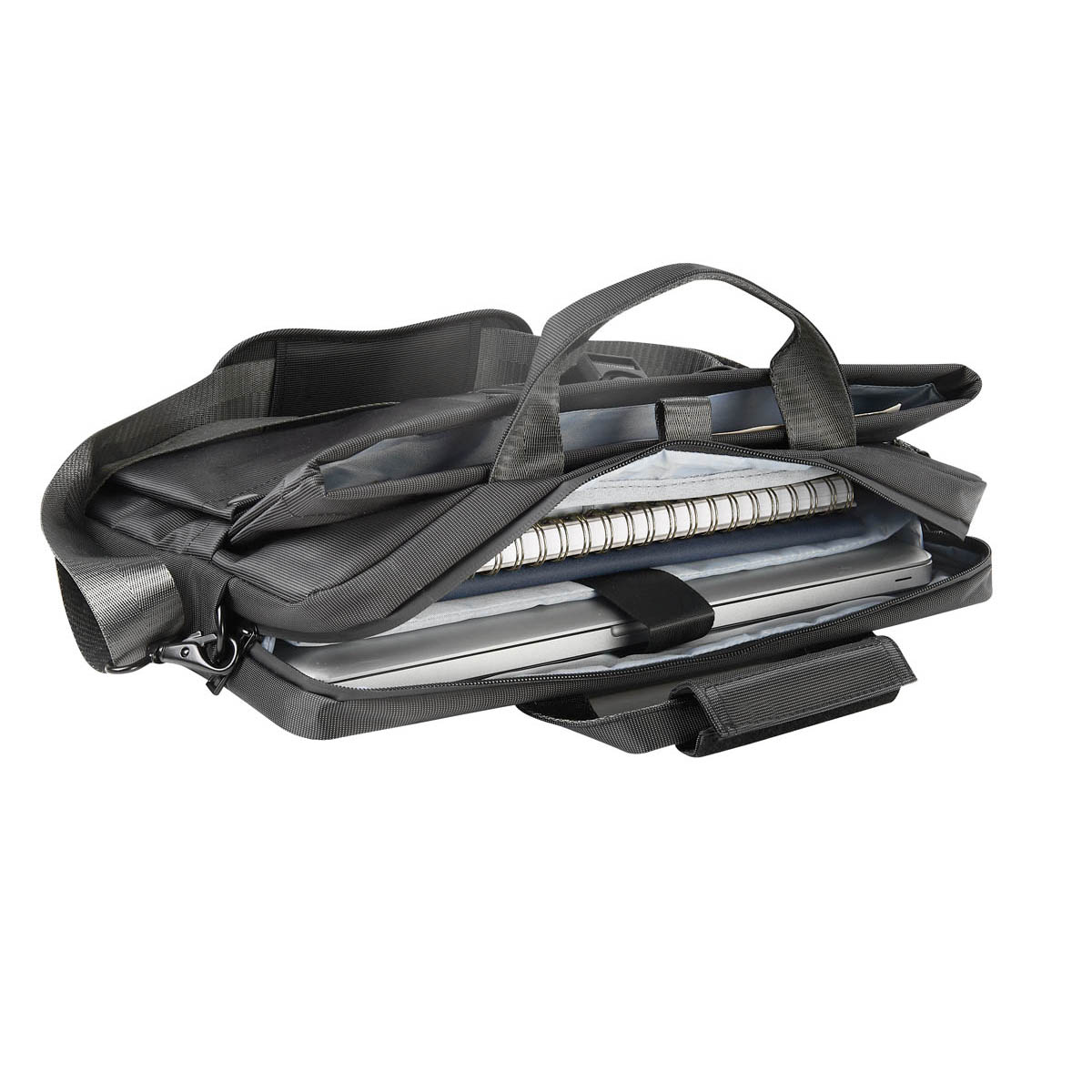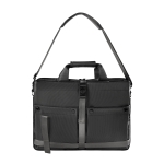 Portafolio ejecutivo con múltiples bolsillos organizadores, ideal para llevar todo lo necesario en un solo accesorio. Su bolsillo principal con cierre, permite guardar una laptop de hasta 15». Bolsillo frontal, con cierre de velcro y broche de plástico, ideal para mantener seguras tus pertenencias de valor, además de dos bolsillos para objetos más pequeños. Asa superior que se une por medio de velcro y un asa removible para hombro con broches metálicos. En la parte posterior, contiene una banda para transportar fácilmente en trolley.