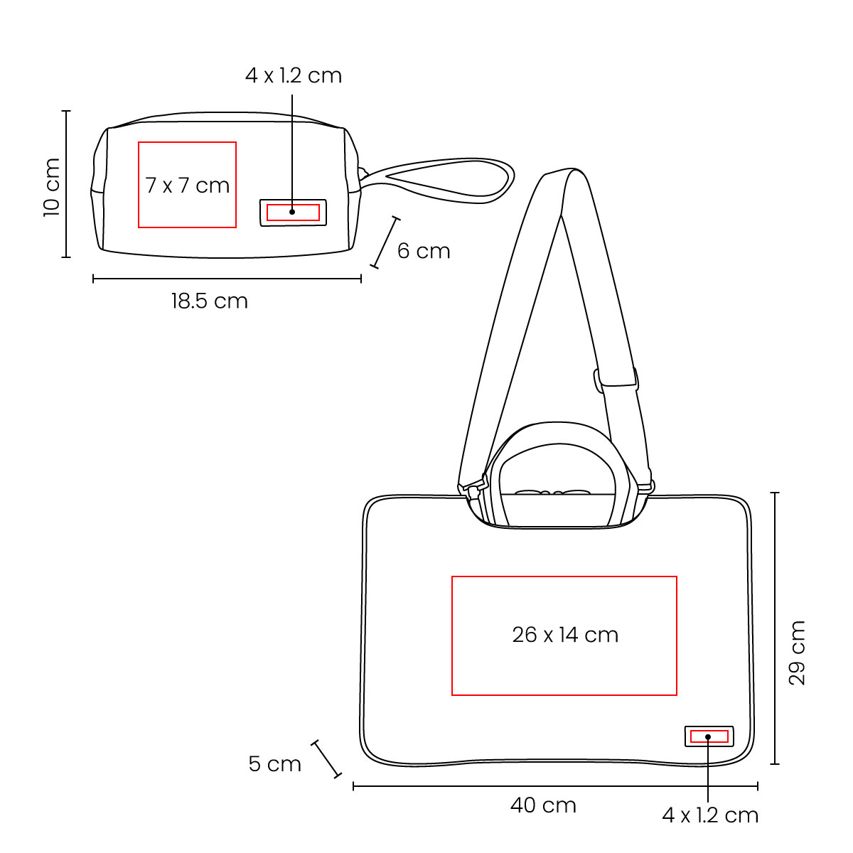 Área de impresión: 26 x 14 cm Portafolio / 7 x 7 cm Estuche /4 x 1.2 cm Placa de PU