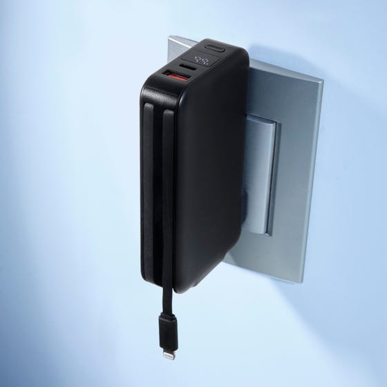 Batería auxiliar para smartphone, capacidad 10,000 mAh. Carga rápida PD 22.5W. Contiene conector para tomacorriente, 1 puerto de entrada/salida USB-C para carga de la batería y de dispositivos y 1 puerto de salida USB para carga de dispositivos. Adicional 2 cables integrados, lightning (8 pines) y USB-C. Incluye display indicador de carga y caja individual.