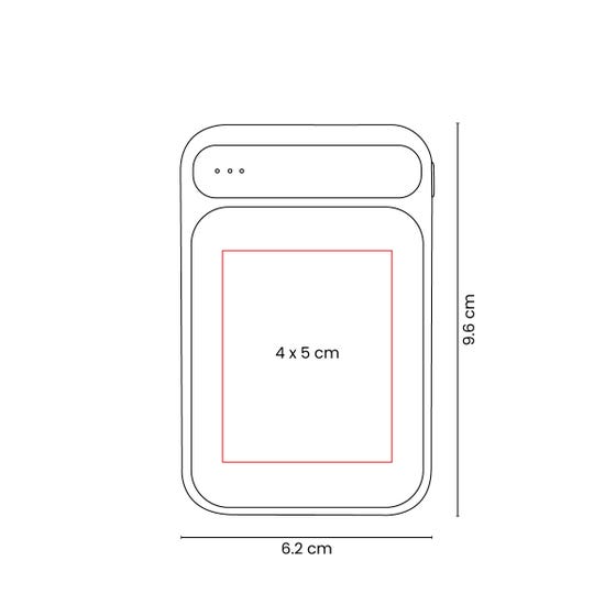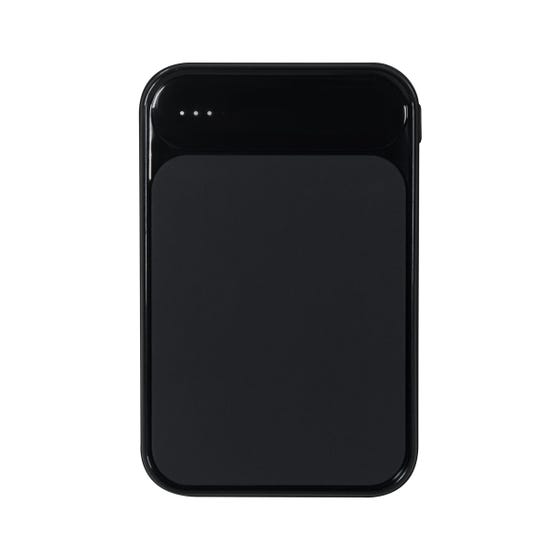 Batería auxiliar para smartphone, capacidad 5,000 mAh. Logotipo se ilumina al aplicar grabado láser. Contiene 2 puertos de salida USB para carga de dispositivos y 1 puerto de entrada tipo C exclusivo para recarga de la batería (no carga dispositivos). Incluye display indicador de carga, cable con conector tipo C y caja individual.