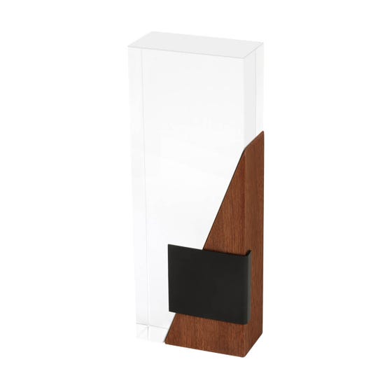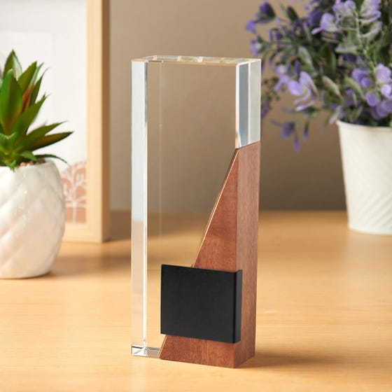 Reconocimiento asimétrico que combina materiales como vidrio, madera y metal, destacando un diseño moderno y minimalista. Cuenta con una placa metálica para su fácil grabado. Destaca un evento memorable, una mención honorifica o celebración especial. Incluye caja de regalo con broche imantado para cerrar y esponja interna para protección. La madera es un producto natural el cual puede presentar variaciones en tonalidades y vetas.