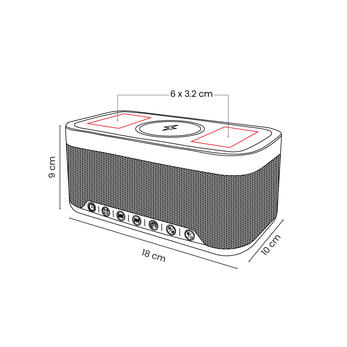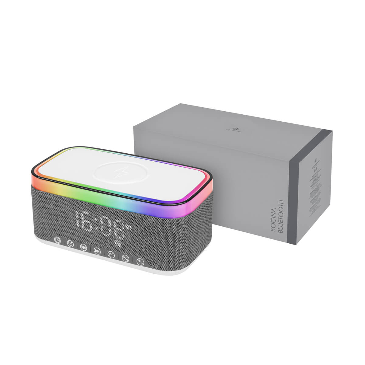 Reloj despertador multifuncional. Integra una bocina con tecnología Bluetooth 5.3, cargador inalámbrico de 15 W e iluminación ambiental con 6 modos de luz. El reloj digital ofrece 3 niveles de brillo (bajo, medio y alto). Cuenta con base antideslizante para evitar movimientos no deseados. Incluye cable de carga tipo C y caja individual.