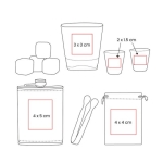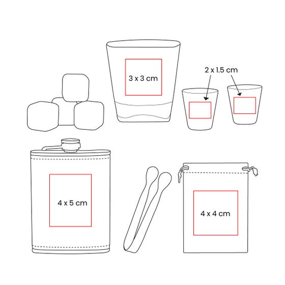 Área de impresión: Caja 15 x 10 cm / Licorera 4 x 5 cm / Vaso 3 x 3 cm / Mini Vaso 2 x 1.5 cm / Bolsa Terciopelo 4 x 4 cm