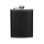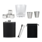 Set de bar. Incluye caja rígida de regalo, licorera con funda de curpiel y tapa con rosca para evitar derrames, vaso de cristal, set de 4 cubos enfriadores con funda de terciopelo, pinzas para hielo y 2 mini vasos metálicos.