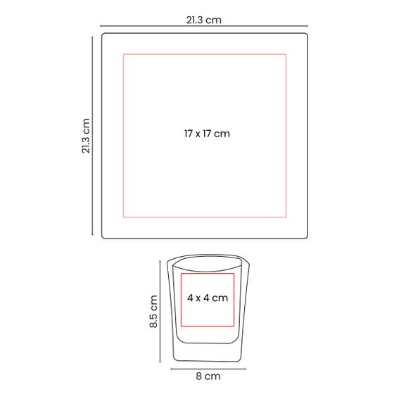Área de impresión: Estuche: 17 x 17 cm / Vasos: 4 x 4 cm