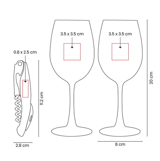 Área de impresión: Copas: 3.5 x 3.5 cm / Sacacorchos: 0.8 x 2.5 cm