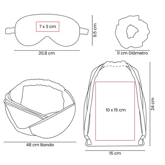 Área de impresión: 10 x 15 cm Bolsa / 7 x 3 cm Antifaz