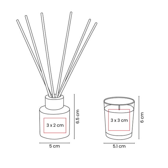 Área de impresión: 3 x 3 cm Vela / 3 x 2 cm Esencia