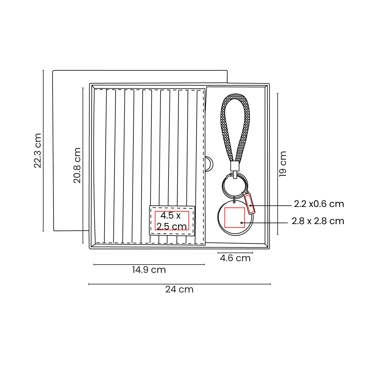 Tamaño: Libreta: 14.9 x 20.8 cm / Llavero: 4.6 x 19 cm / Placa: 2.6 x 0.8 cm / Caja: 24 x 22.3 x 2.8 cm