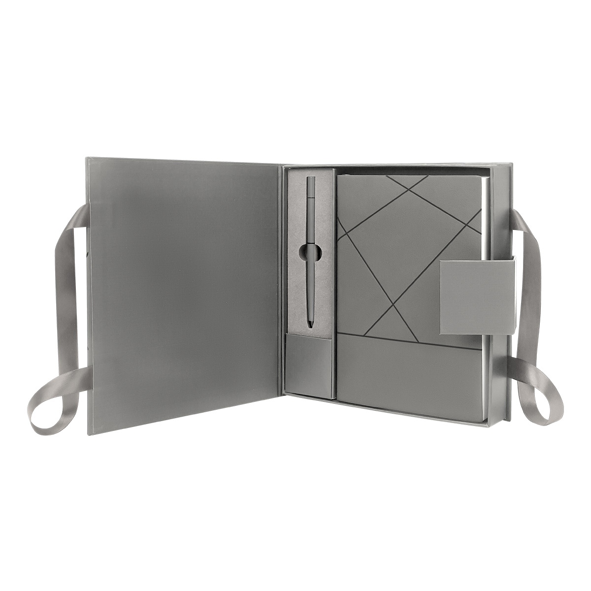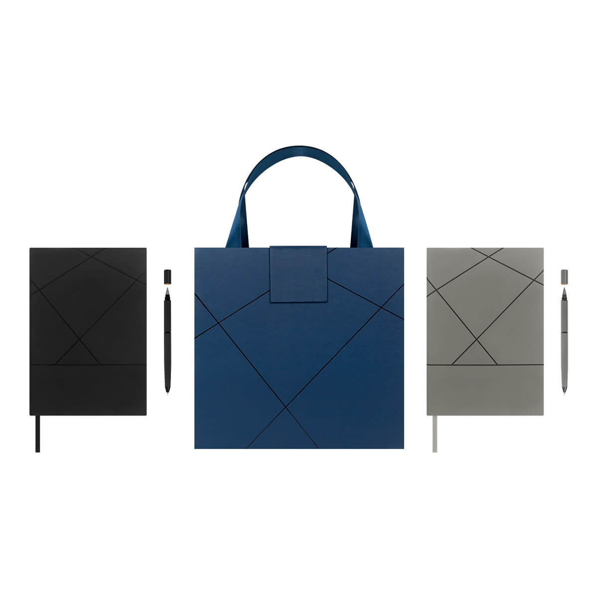 Elegante y original set de regalo que consta de libreta con 100 hojas a rayas, cubierta rígida de curpiel y listón separador. Como complemento, cuenta con un bolígrafo de metal con terminado mate, con punta clásica y la funcionalidad de un lápiz infinito en la parte superior. Incluye caja de regalo con cierre imantado y asas de fino material, que le dan un toque más sofisticado.