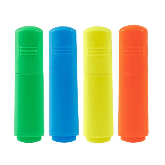 Incluye 4 marcatextos en colores azul, amarillo, verde y naranja, en un práctico estuche ecológico con ventana. Diseño compacto, ideal para oficina o escuela.