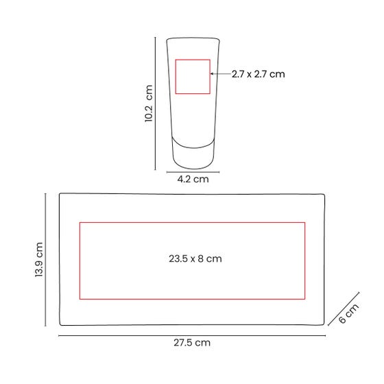 Área de impresión: Vasos: 2.7 x 2.7 cm / Estuche: 23.5 x 8 cm