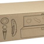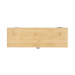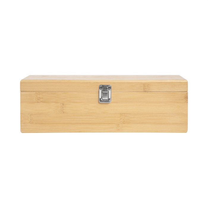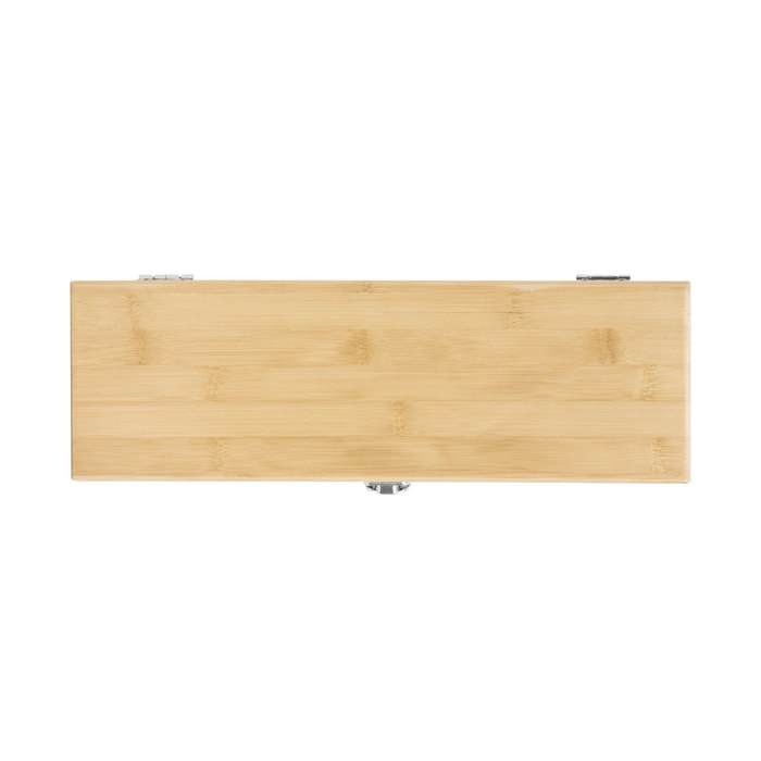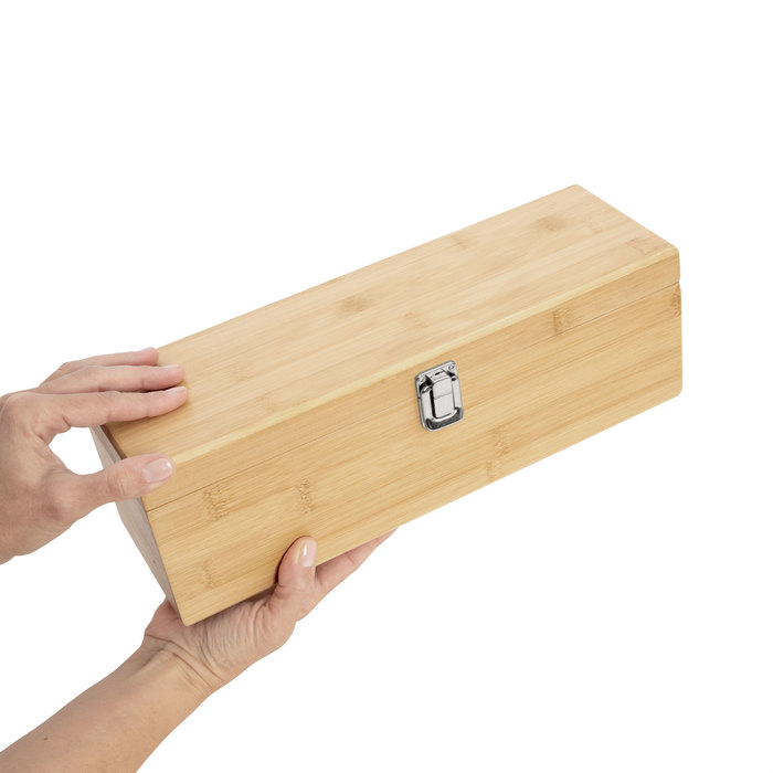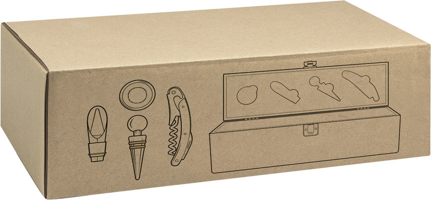 Set de vino. Caja de bambú portabotellas con cierre metálico. Bandeja de eva con set de 4 accesorios: sacacorchos, anillo antigoteo, tapón y vertedor.