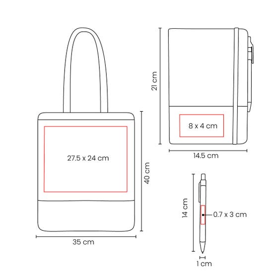 Área de impresión: Caja 20 x 15 cm / Bolsa 27.5 X 24 cm / Libreta 8 x 4 cm / Bolígrafo 0.7 x 3 cm