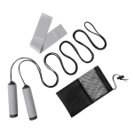 Set deportivo con accesorios para entrenamiento funcional. Contiene una cuerda para saltar y una banda de resistencia. Ligero, práctico y listo para acompañarte en cada rutina. Incluye bolsa con jareta.