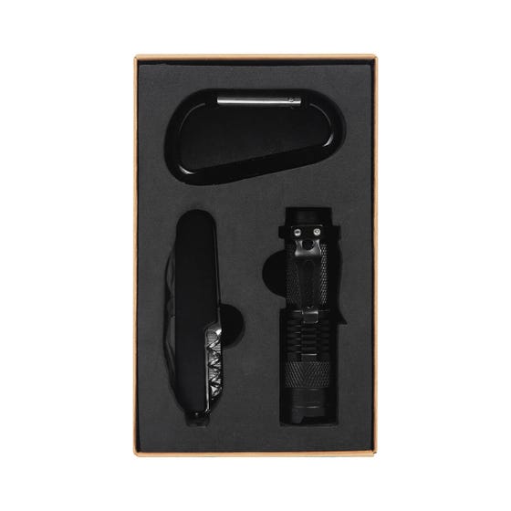Set de herramientas multiusos. Incluye gancho metálico, lámpara con luz ajustable y navaja con 9 funciones: (navaja, sierra, tijeras, destapador, abrelatas, sacacorchos, guía de hilo, lima y desarmador de cruz). Incluye caja individual.