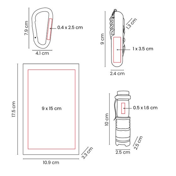 Área de impresión: Carabina 0.4 x 2.5 cm / Navaja 1 x 3.5 cm / Lámpara 0.5 x 1.6 cm / Caja 9 x 15 cm