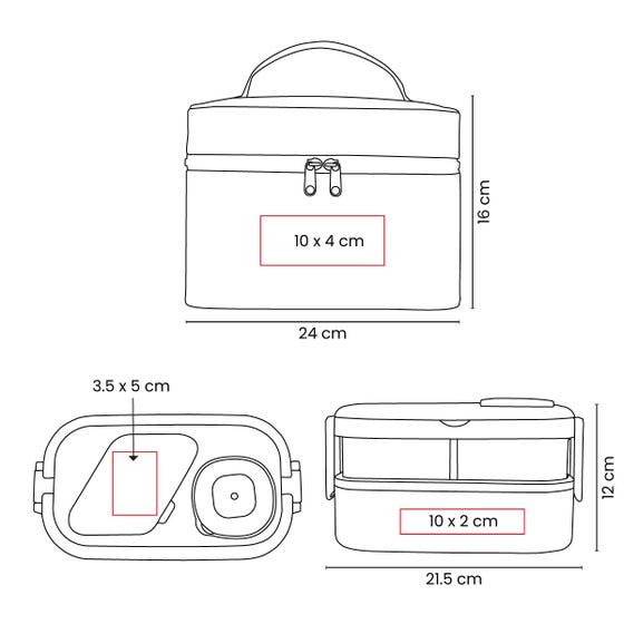 Área de impresión: 10 x 4 cm Lonchera / 3.5 x 5 cm y 10 x 2 cm Portaviandas