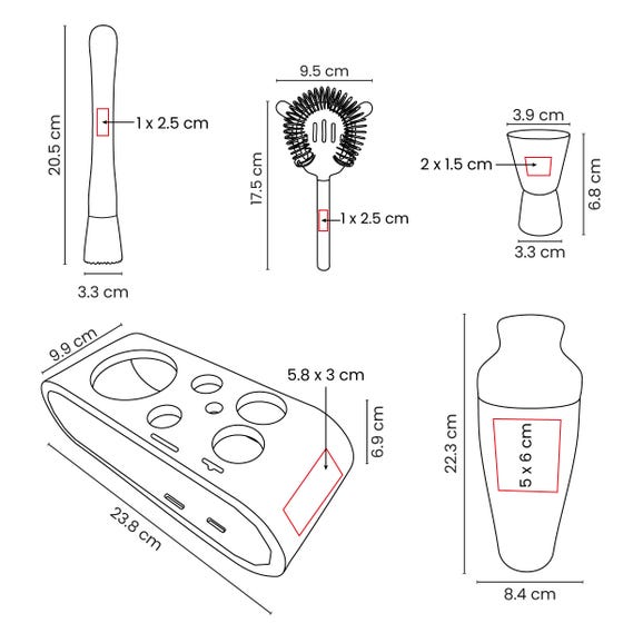 Área de impresión: Shaker: 5 x 6 cm / Base de bambú: 5.8 x 3 cm / Dosificador: 2 x 1.5 cm / Macerador: 1 x 2.5 cm / Filtro: 1 x 2.5 cm