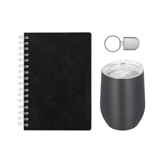 Set de regalo. Incluye libreta con 70 hojas, termo de acero inoxidable de 350 ml y llavero. La caja cuenta con cierre de solapa imantada. Brinda un regalo con estilo y utilidad. El máximo de sets disponibles para la venta está relacionado al stock de los productos que contienen.