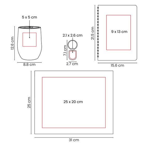 Área de impresión: Caja 25 x 20 cm / Termo 5 x 5 cm / Libreta 9 x 13 cm / Llavero 2.1 x 2.6 cm