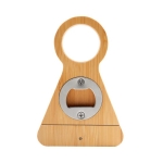 Práctico sacacorchos con destapador. Cuenta con una innovadora función de soporte para botellas imantado, su diseño con troquelado redondo permite apoyar la botella de manera segura. Adicional, en la parte posterior incluye un destapador metálico, logrando un complemento perfecto. La madera es un producto natural el cual puede presentar variaciones en tonalidades y vetas.