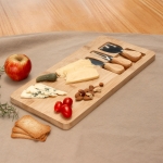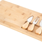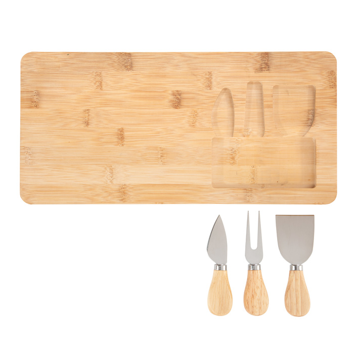 Tabla de bambú con set de 3 utensilios de acero inoxidable 420 con mango de madera de caucho: 1 cuchillo, 1 tenedor y 1 espátula.