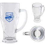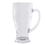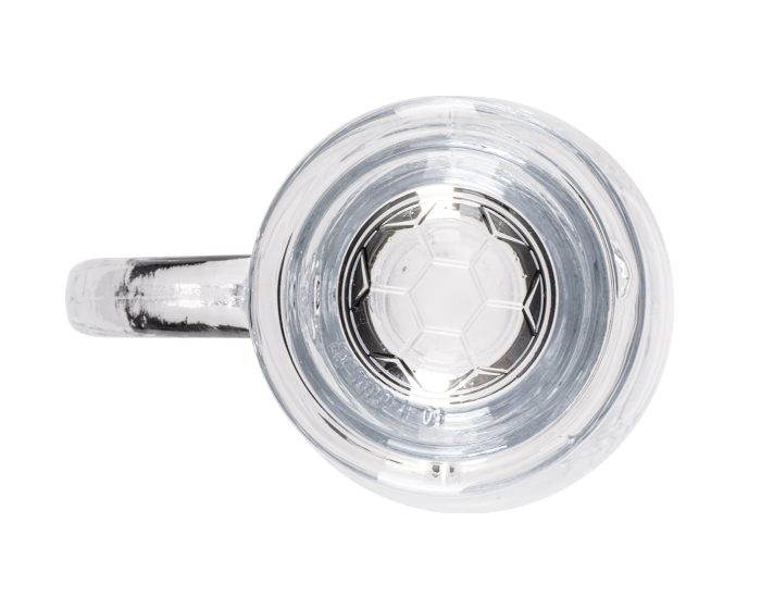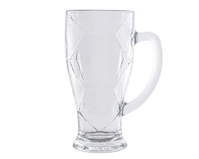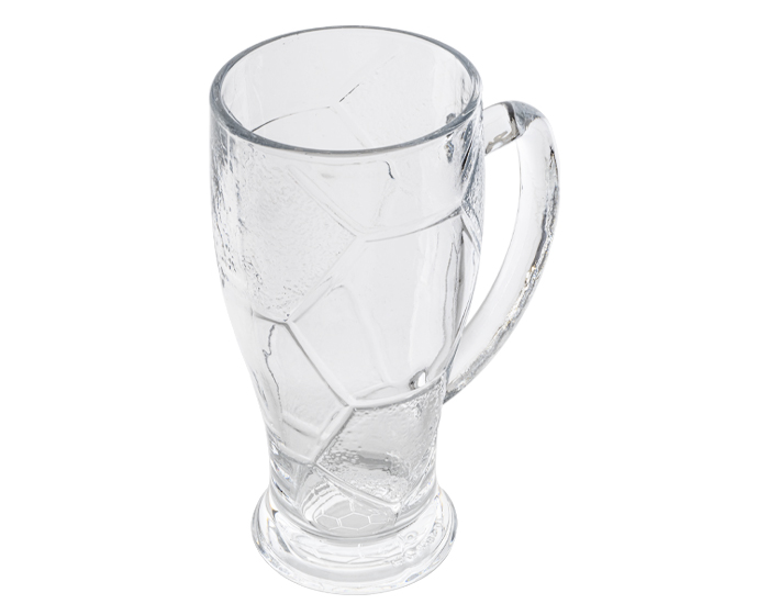 Tarro de vidrio para cerveza, con diseño de exágonos de balón de fútbol soccer. CAP. 420 ml. (14 OZ). Venta en múltiplos de 2.
